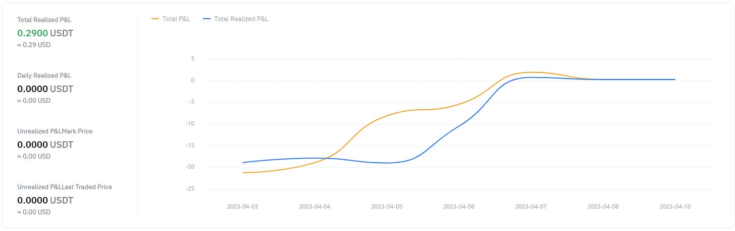 This time both, best and worst, trades were done on $SXP. Where I lost first, as I got Short on the runup, which I definitely should not do. Got in Short again on the backside and also lost some profits on the table as my last profit taking took place in the $0.67s. I could have waited a few days more and would have gotten 10 cents more per token. Holding on to winning trades is not easy and I will keep working on it until I see some major reason to exit, like price levels coupled with volume. See the P&L chart below.